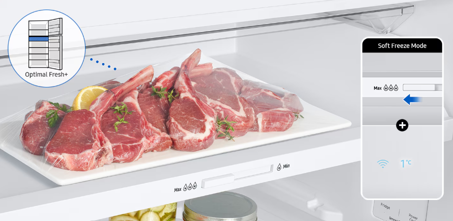 Les aliments restent frais plus longtemps grâce au tiroir Optimal Fresh+ du réfrigérateur Samsung RT47CG6442B1EL. Ce tiroir a quatre modes pour garder différents types d'aliments. En mode Congélation douce, il garde la fraîcheur de la viande et du poisson, les conservant deux fois plus longtemps que les méthodes normales tout en gardant leur goût naturel.